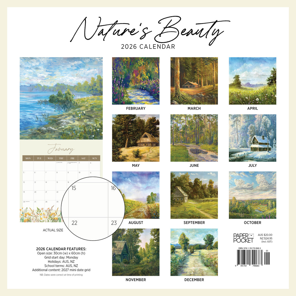 Experience nature's beauty from the comfort of your home or office, with 12 Illustrations capturing the beauty of the natural world. This square wall calendar covers 18-Months. Every month of the year from January 2026 to December 2026 is included, with 2027 dates also listed on a separate single-page overview. The size of the wall calendar is 300mm x 600mm when opened. Each week displayed in the calendar begins on a Monday, and all major Public Holidays and 2026 School Term dates for Australian and New Zealand Public Schools are also included. You won't miss a beat in 2026! Additional Information: Number of months: 18 Month Wall Calendar Month to View Size: 300 x 300 mm (closed) | 300 x 600 mm (opened) Weight: 250 grams *Inclusive of GST.